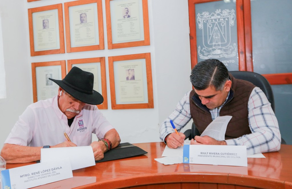 En la firma del convenio estuvieron presentes, la Síndica municipal, Itzel Ríos de la Mora; el Secretario del Ayuntamiento, Francisco Ánzar Herrera; la Regidora Alondra López y el Subdirector del Instituto Ateneo de Colima, Ignacio Arce.