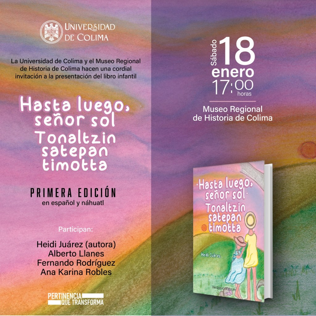 A las 5 de la tarde, en el Museo Regional de Historia de Colima, se presentará el libro bilingüe (español-náhuatl) “Hasta luego, señor sol • Tonaltzin satepan timotta”, de la autora Heidi Juárez Robles. La obra, publicada por la Universidad de Colima, aborda temas como la infancia y el abandono paterno, acompañados por ilustraciones realizadas por la propia autora.