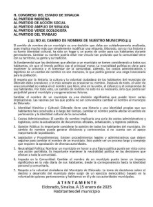 En el documento, fechado el 15 de enero de 2025, los habitantes subrayaron que Eldorado, que recientemente obtuvo su autonomía al dejar de ser sindicatura de Culiacán, cuenta con una rica historia y un profundo arraigo entre sus pobladores. Cambiar el nombre, según la carta, podría diluir ese sentido de pertenencia y generar divisiones innecesarias en la comunidad.