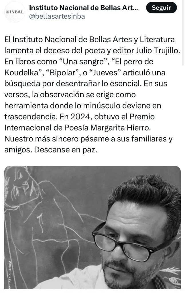 Avanzada (17/01/2025).- El Instituto Nacional de Bellas Artes y Literatura (Inbal) confirmó y lamentó el fallecimiento del poeta mexicano Julio Trujillo, quien había sido reportado como desaparecido desde el pasado 10 de enero en Cornwall, Inglaterra.