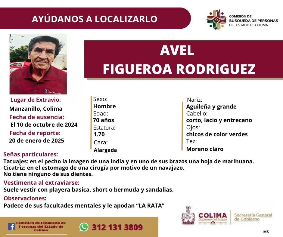 Colima, México, Comunicado (22/01/2025).- La Comisión de Búsqueda de Personas del Estado de Colima solicita el apoyo de la ciudadanía para localizar a Avel Figueroa Rodríguez, un hombre de 70 años desaparecido en Manzanillo, Colima, desde el 10 de octubre de 2024.