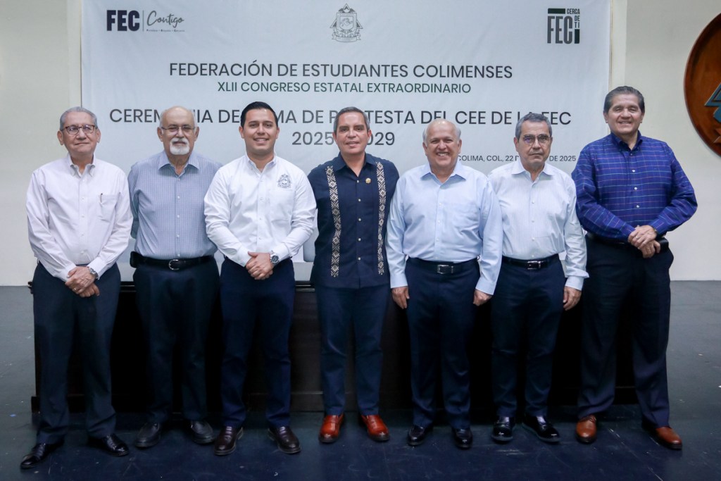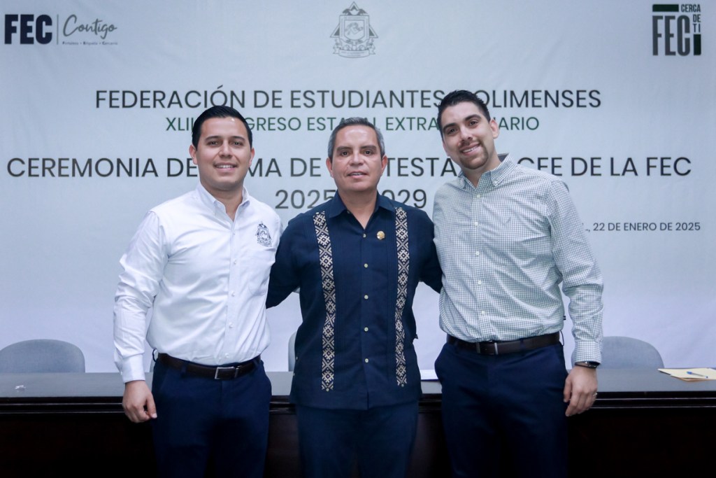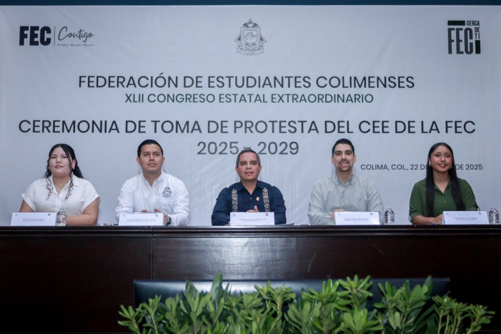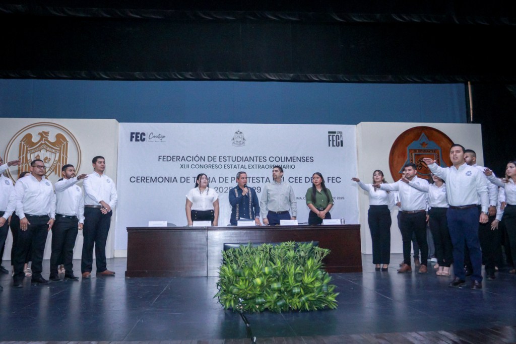 Colima, México, Comunicado (22/01/2025).- Este miércoles, en el Paraninfo Universitario, el rector de la Universidad de Colima, Christian Jorge Torres Ortiz Zermeño, tomó protesta al nuevo Comité Ejecutivo Estatal de la Federación de Estudiantes Colimenses (FEC), encabezado por su presidente, Jaime Alejandro Novela Castañeda, quien liderará esta organización durante el periodo 2025-2029.