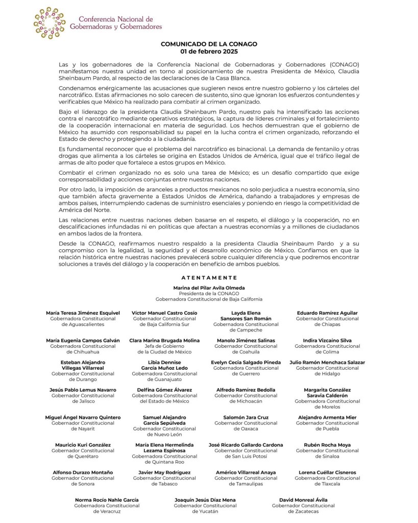 Gobernadores respaldan a Sheinbaum ante acusaciones de la Casa Blanca