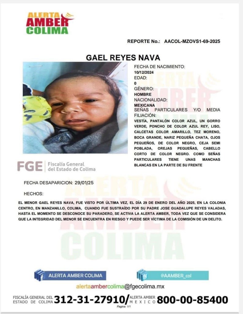 Colima, México, Avanzada (04/02/2025).- La Fiscalía General del Estado de Colima activó una Alerta Amber para localizar a Gael Reyes Nava, un bebé de apenas un mes y medio de edad, quien fue sustraído el pasado 29 de enero en la colonia Centro de Manzanillo.