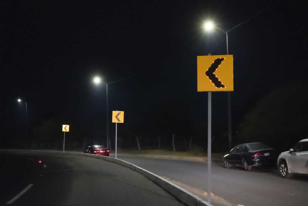 Acompañada por los dirigentes trasportistas Hugo Chávez, Felipe Guerra, Horacio Torres, Jesús García y Juan José Navarro, la Presidenta Municipal entregó 120 vialetas colocadas sobre el asfalto, equipadas con luz de tecnología LED, y cinco señalamientos tipo Chevron, también con luz de tecnología LED, cuyo funcionamiento de ambas es con energía solar.