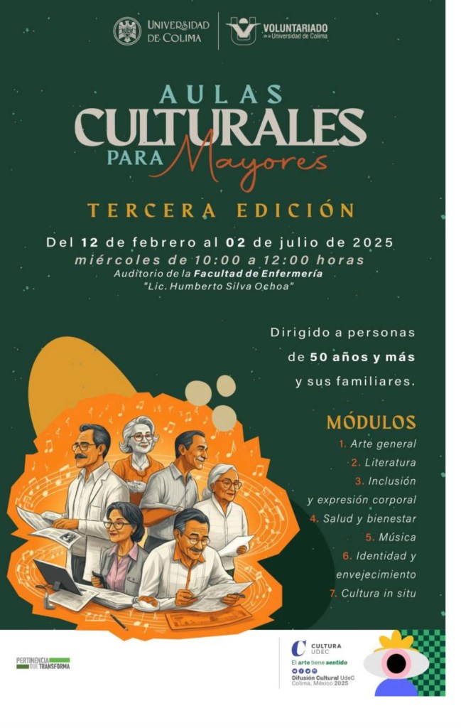 Colima, México, Comunicado (09/02/2025).- La Universidad de Colima (UdeC) invita a la tercera edición de las Aulas Culturales para Mayores, un programa diseñado para fomentar el desarrollo humano, la inclusión y el bienestar de las personas mayores de la comunidad universitaria y del estado. Este año, el programa se renueva con nuevas actividades, horarios y sedes, buscando llegar a un mayor número de participantes y descentralizar la oferta cultural. Lo organizan la Coordinación General de Extensión a través de su Dirección General de Difusión Cultural y el Voluntariado Universitario.
