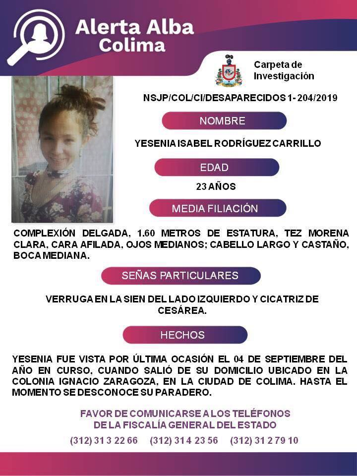 Yesenia Isabel Rodríguez Carrillo, de 23 años de edad, no ha sido vista desde el pasado 4 de septiembre, cuando salió de su casa ubicada en la colonia Ignacio Zaragoza de la ciudad de Colima.