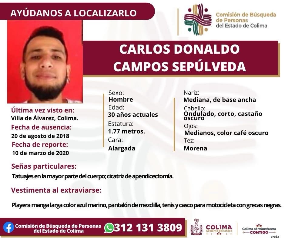 Colima, México, Avanzada (10/02/2025).- La Comisión de Búsqueda de Personas del Estado de Colima emitió una ficha para localizar a Carlos Donaldo Campos Sepúlveda, quien fue visto por última vez el 20 de agosto de 2018 en Villa de Álvarez, Colima. Su desaparición fue reportada el 10 de marzo de 2020.