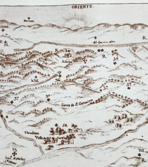 Sección de un mapa elaborado por el Capitán Ponce, hacia 1789, en la que se detalla la zona minera en los alrededores de Santa María de Guadalupe de Tecalitlán.