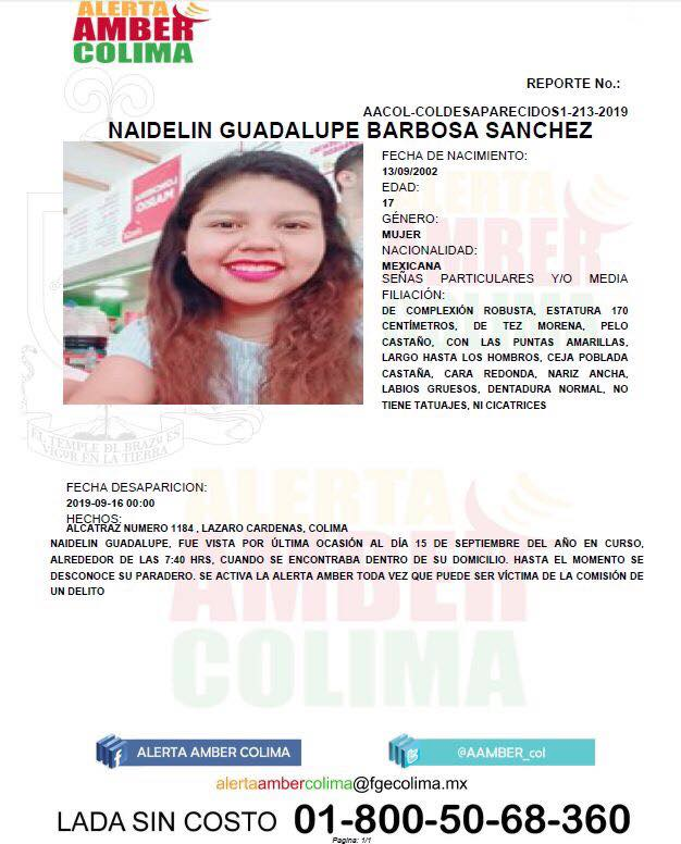 Fue reportada como desaparecida, Naidelin Barbosa Sánchez, quien fue vista por última vez el pasado 15 de septiembre al interior de su domicilio en la colonia Lázaro Cárdenas en Colima.