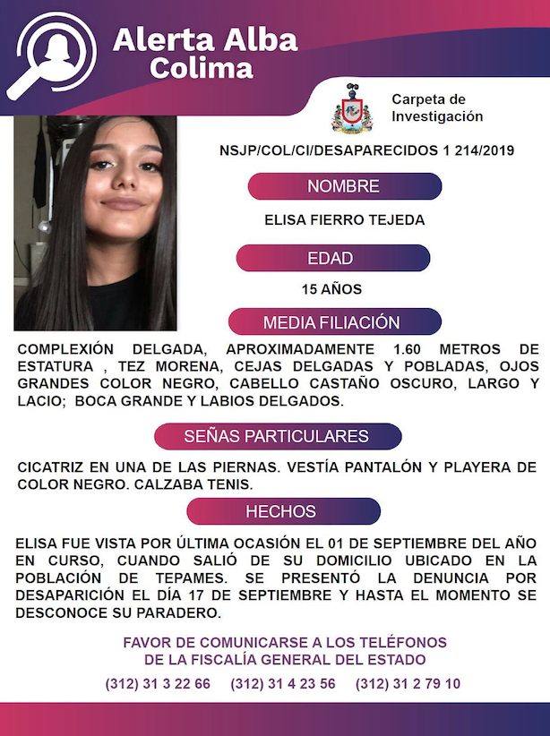 La Fiscalía investiga la desaparición de Elisa Fierro Tejeda de 15 años de edad, quien desapareció en Tepames; Laura Nayeli Cobián, quien salió de su domicilio en el Centro de Colima el 30 de agosto.