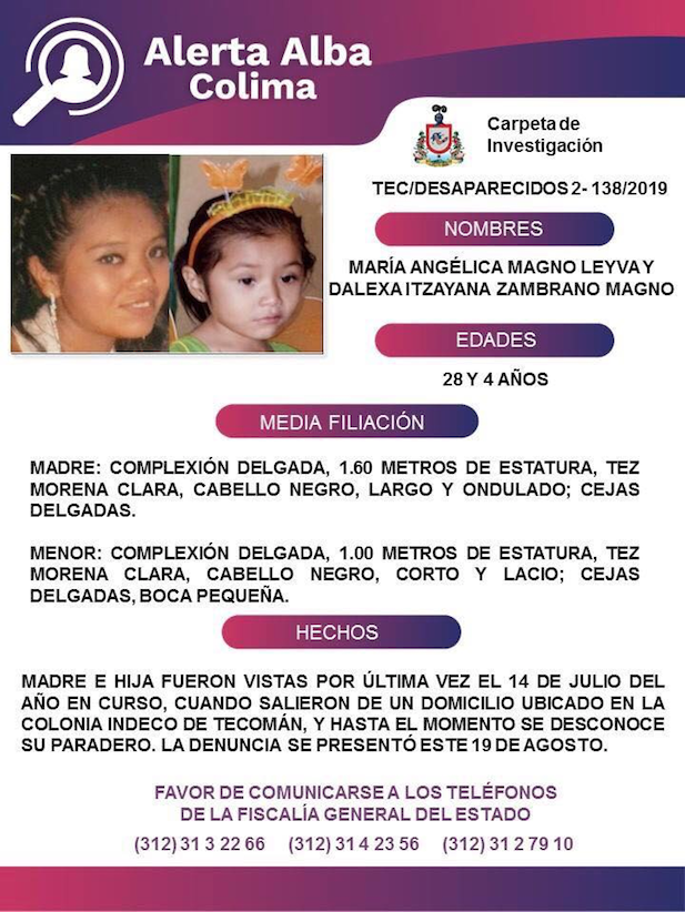 La Fiscalía General tiene abierta una carpeta de investigación para localizar a Viridiana Tapia Cárdenas de 24 años de edad. La denuncia fue presentada el 7 de agosto. En Tecomán, desapareció, Silvia Moreno Valadez y María Angélica Magno junto con su hija, de 4 años de edad, Dalexa Zambrano Magno.