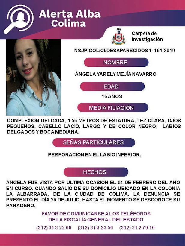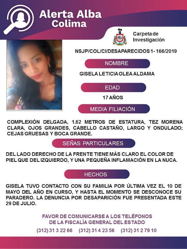 Asimismo, la Alerta Alba anunció la desaparición de Gisela Leticia Olea de 17 años de edad; María Fernanda Velasco Solano de 20 años de edad. Así como Paulina Jazmín Chávez Vázquez, quien fue vista por última vez el 31 de julio en la colonia La Gloria en Villa de Álvarez.