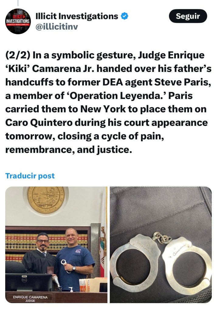 Enrique “Kiki” Camarena Jr., quien hoy es juez en Estados Unidos, decidió que las esposas de su padre—un agente de la DEA infiltrado en el Cártel de Guadalajara—fueran utilizadas en la comparecencia de Caro Quintero ante la corte de Nueva York. Un gesto que no solo representa el cierre de un capítulo doloroso, sino que envía un mensaje claro: la justicia, aunque tarde, llega.