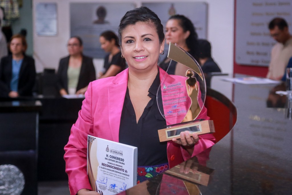 Gladys Espinoza, asesora pedagógica del Bachillerato en línea e integrante del colectivo “Mujeres de fuego”, cocineras tradicionales de Colima, recibió la presea “Sara Martínez Pizano” por impulsar la participación democrática en la vida política, social y cultural de mujeres que habitan en zonas rurales.
