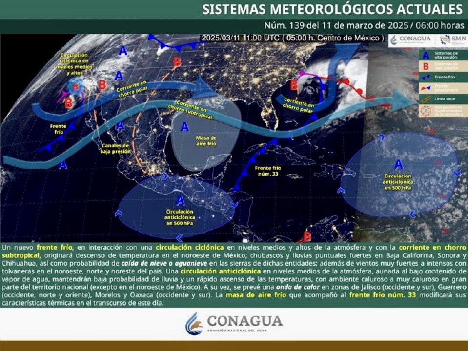 Aunque un nuevo frente frío afecta el noroeste del país, generando lluvias, vientos fuertes y hasta caída de nieve en estados como Baja California, Sonora y Chihuahua, su impacto no alcanzará al estado de Colima. En contraste, en el occidente del país predominará el calor extremo, con una onda de calor que afectará principalmente a Jalisco.
