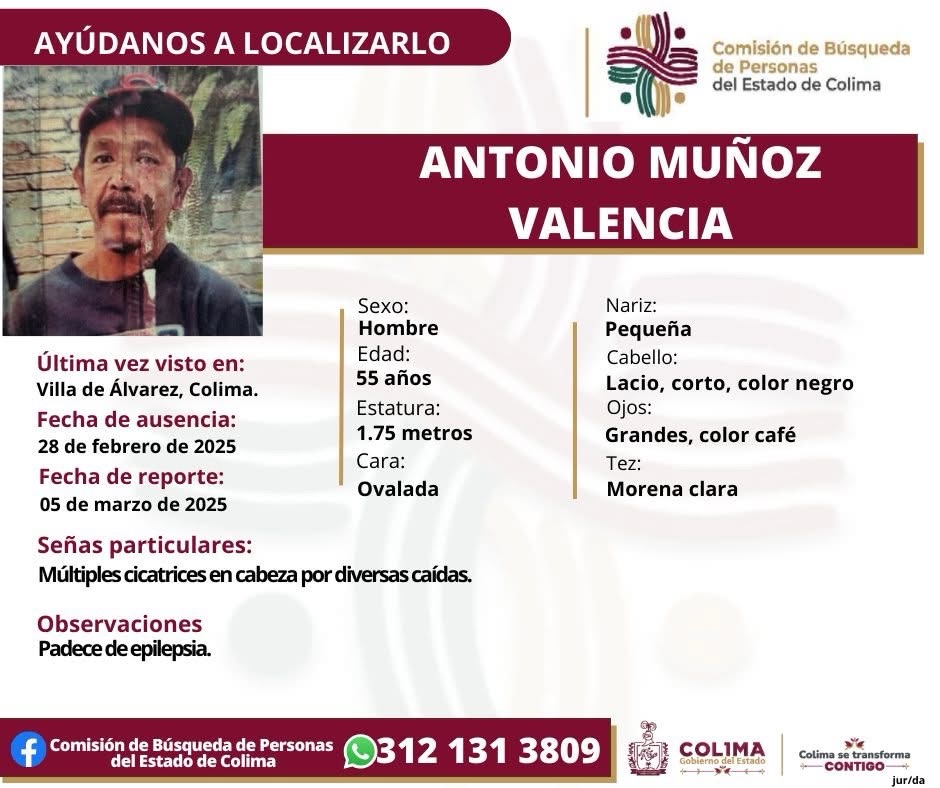 Villa de Álvarez, Colima, Avanzada (12/03/2025).- La Comisión de Búsqueda de Personas del Estado de Colima ha emitido una ficha de búsqueda para localizar a Antonio Muñoz Valencia, un hombre de 55 años que desapareció el pasado 28 de febrero de 2025 en Villa de Álvarez, Colima.