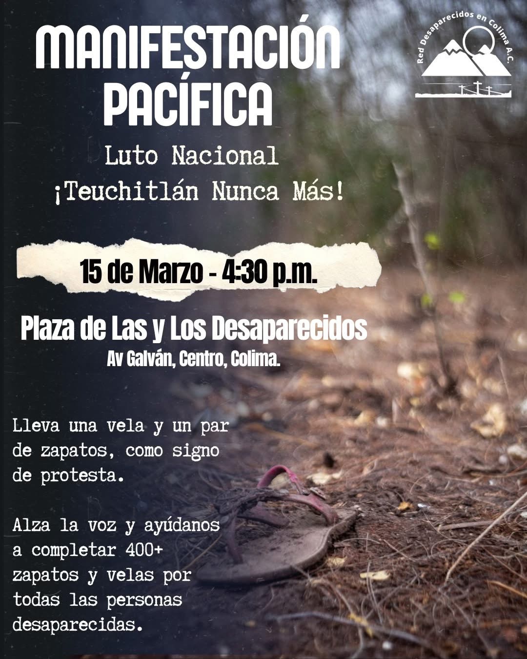 Colima, México, Avanzada (13/03/2025).- Con el lema “Teuchitlán Nunca Más”, familias buscadoras y colectivos de derechos humanos convocan a una manifestación pacífica el próximo 15 de marzo a las 16:30 horas en la Plaza de Las y Los Desaparecidos, ubicada en Avenida Galván, en el Centro de Colima.