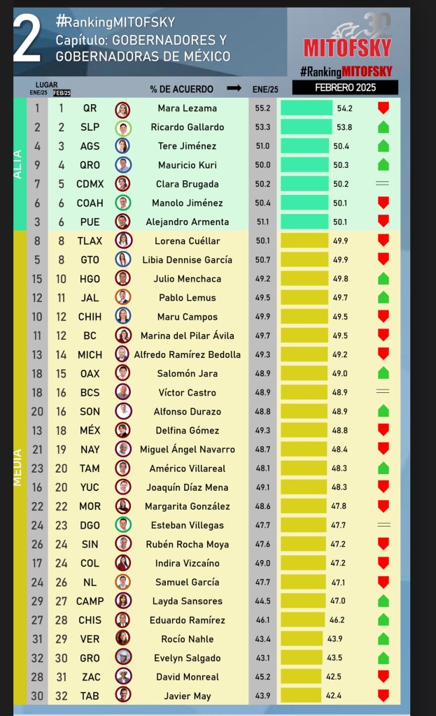 El ranking sitúa a Mara Lezama de Quintana Roo como la gobernadora mejor evaluada con 54.2% de aprobación, mientras que los mandatarios con menor respaldo son Javier May de Tabasco con 42.4% y David Monreal de Zacatecas con 45.2%.