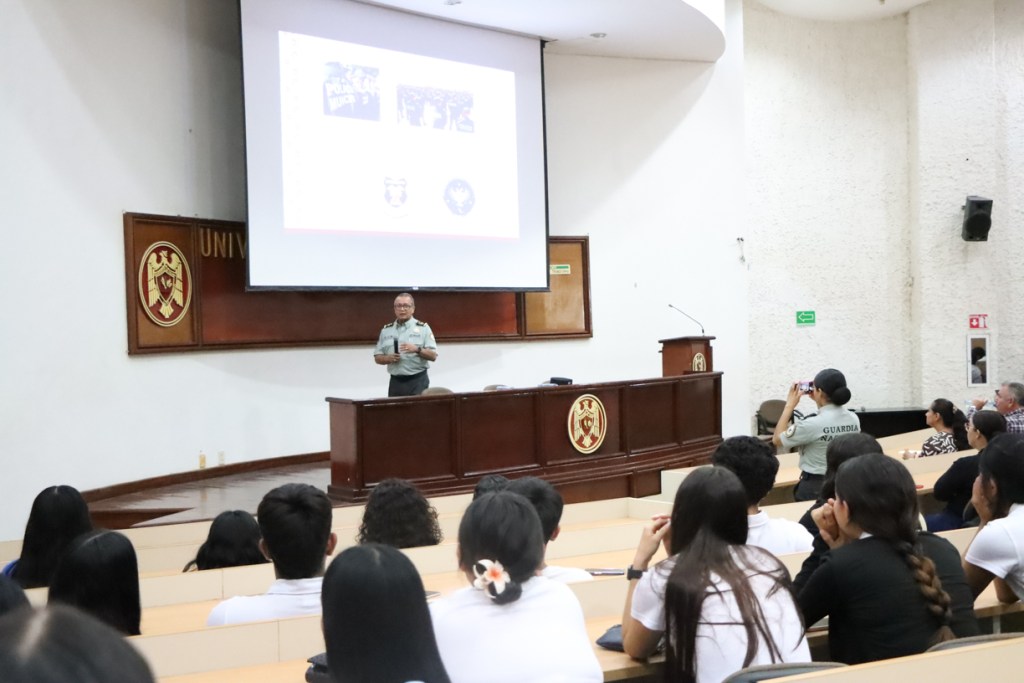 Colima, México, Comunicado (19/03/2025).- Alumnos de bachillerato 35 de la Facultad de Contabilidad y Administración, así como de las Facultades de Ciencias Biológicas y Agropecuarias (FCBA) y de Medicina Veterinaria y Zootecnia (FMVZ) de la Universidad de Colima, participaron esta semana en la charla informativa “La Guardia Nacional: alcances y Funciones”, impartida por el coordinador estatal de la institución, el general de brigada Juan Carlos Guzmán Giadans.