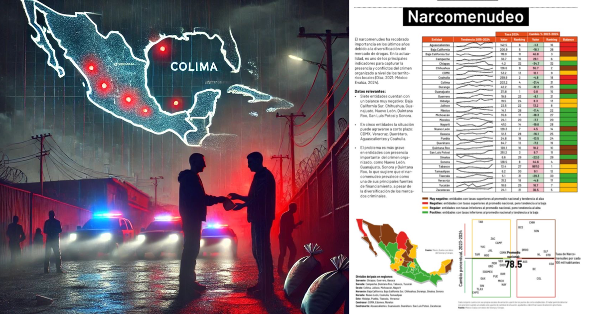 Si bien Colima registró una disminución en la tasa de narcomenudeo entre 2023 y 2024, sigue figurando entre las entidades con tasas delictivas por encima del promedio nacional, que es del 78.5 %, junto con Baja California, Chihuahua, Guanajuato, Nuevo León, Quintana Roo, San Luis Potosí y Sonora, entre otros. El estado enfrenta un balance negativo en el combate al narcomenudeo.