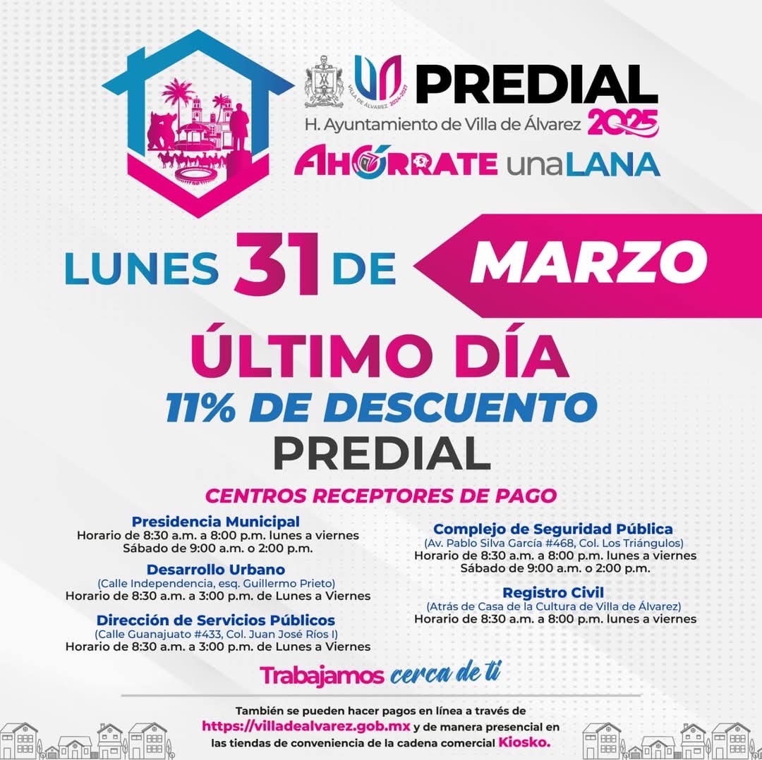 Villa de Álvarez, Colima, Comunicado, (28/03/2025).- Este lunes 31 de marzo será el último día para aprovechar el descuento del 11 por ciento que el Ayuntamiento de Villa de Álvarez ofrece a los contribuyentes del Impuesto Predial, esto a quienes paguen por adelantado el gravamen correspondiente al año 2025.