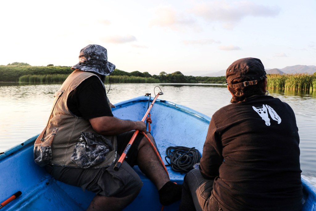 Una vez en las lanchas, el equipo de expertos, expertas y estudiantes se dedicó a la observación, registro y análisis de la población de estos reptiles en su hábitat natural. Durante la jornada, la noche fría, oscura y sin luna sirvió de cobijo para los excursionistas. A la intemperie, en plena laguna, lograron avistar más de treinta cocodrilos de río (Crocodylus acutus) flotando en el agua, con los ojos ligeramente rojos asomando justo sobre la superficie.