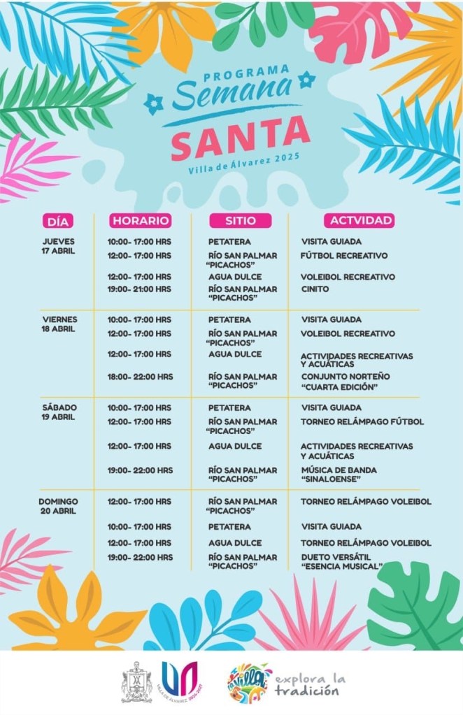 Cindy Lilian Vaca, Directora de Turismo Municipal, apuntó que los jueves, viernes, sábado y domingo de las semanas Santa y Pascua habrá visitas guidas en la Plaza de Toros La Petatera, de 10 AM a 5 PM; en el Río San Palmar, en Picachos, y en Agua Dulce de las 12:00 a las 5:00 PM habrá torneos de voleibol y futbol, además de actividades recreativas y acuáticas.