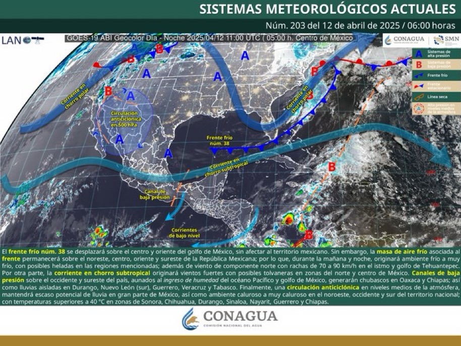 Aunque el frente frío número 38 se encuentra desplazándose sobre el Golfo de México sin impacto directo en el territorio nacional, su masa de aire frío genera un contraste notable con las condiciones del occidente del país, donde Colima experimentará un ambiente caluroso a muy caluroso, con temperaturas que podrían alcanzar entre los 35 y 40 °C.