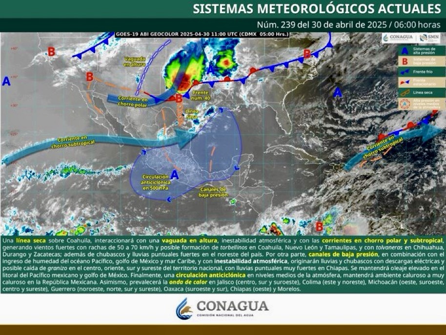Colima, México, Avanzada (30/04/2025).- Las autoridades meteorológicas alertaron sobre condiciones climáticas extremas que afectarán a Colima este miércoles, con temperaturas máximas de entre 35 y 40 grados Celsius, posibles tolvaneras, y oleaje elevado en la zona costera.