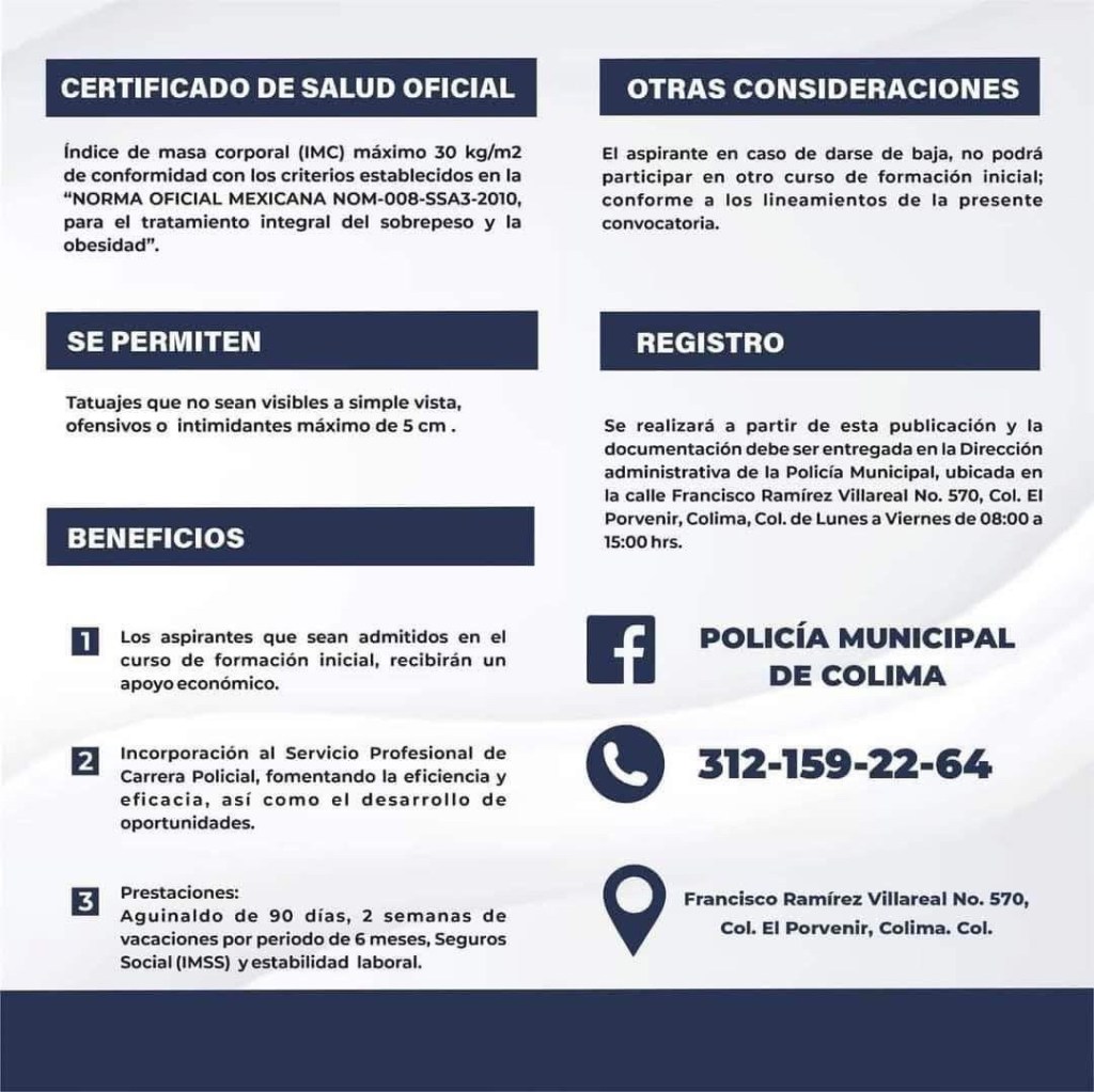 Conscientes de la importancia de contar con una fuerza policial profesional, capacitada y cercana a la ciudadanía, esta convocatoria busca fortalecer el estado de fuerza del municipio, priorizando la prevención, la legalidad y el respeto a los derechos humanos. La seguridad pública es una tarea que requiere del compromiso de todas y todos, por lo que se invita a quienes aspiren a contribuir a la construcción de otro Colima más seguro y en paz a participar en este proceso.