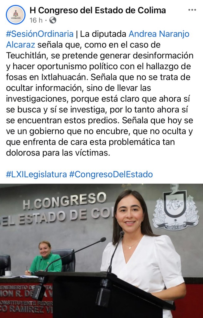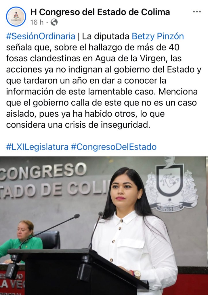 La diputada priista afirmó que en Colima no solo se vive con miedo, sino también con opacidad y derecho cómplice. Recordó que el predio donde se encontraron los restos mide 42 hectáreas y que los cuerpos estaban incinerados y cercenados, muchos de ellos pertenecientes a mujeres de entre 25 y 39 años. Además, criticó que los colectivos no pudieron participar en las labores de búsqueda.
