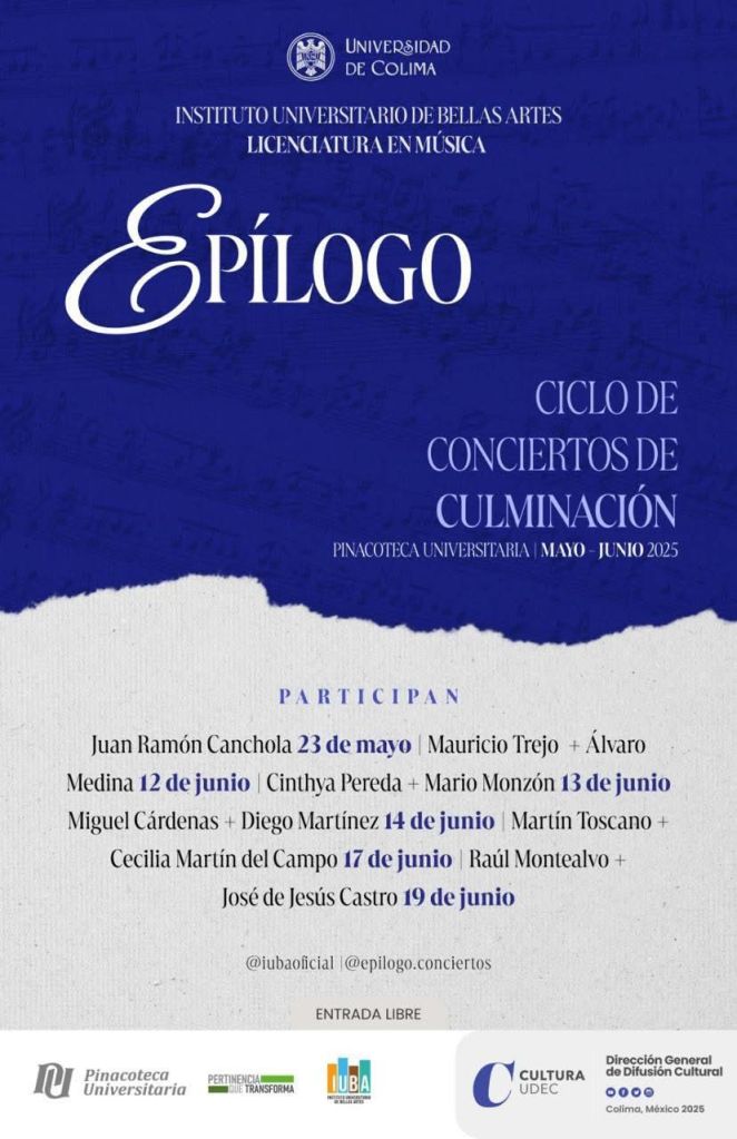 El Departamento de Música ofrecerá un Curso de Canto impartido por el tenor Mariano Fernández, los días 19 y 20 de mayo. Además, estudiantes de octavo semestre de la Licenciatura en Música presentarán el ciclo de conciertos de culminación “Epílogo”, con recitales de guitarra, violín y piano que se realizarán el 23 de mayo, y los días 12, 13, 14, 17 y 19 de junio en la Pinacoteca Universitaria.