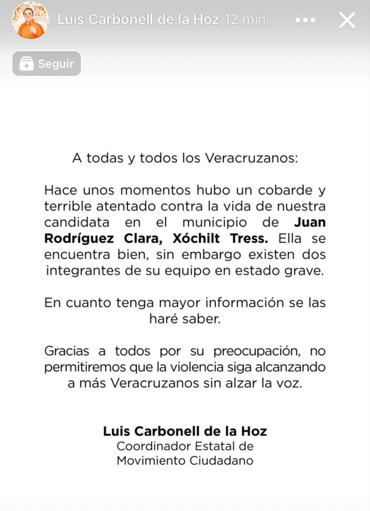 Luis Carbonell de la Hoz, dirigente estatal de Movimiento Ciudadano, confirmó el fallecimiento de la también periodista y expresó sus condolencias a familiares y compañeros de la víctima.