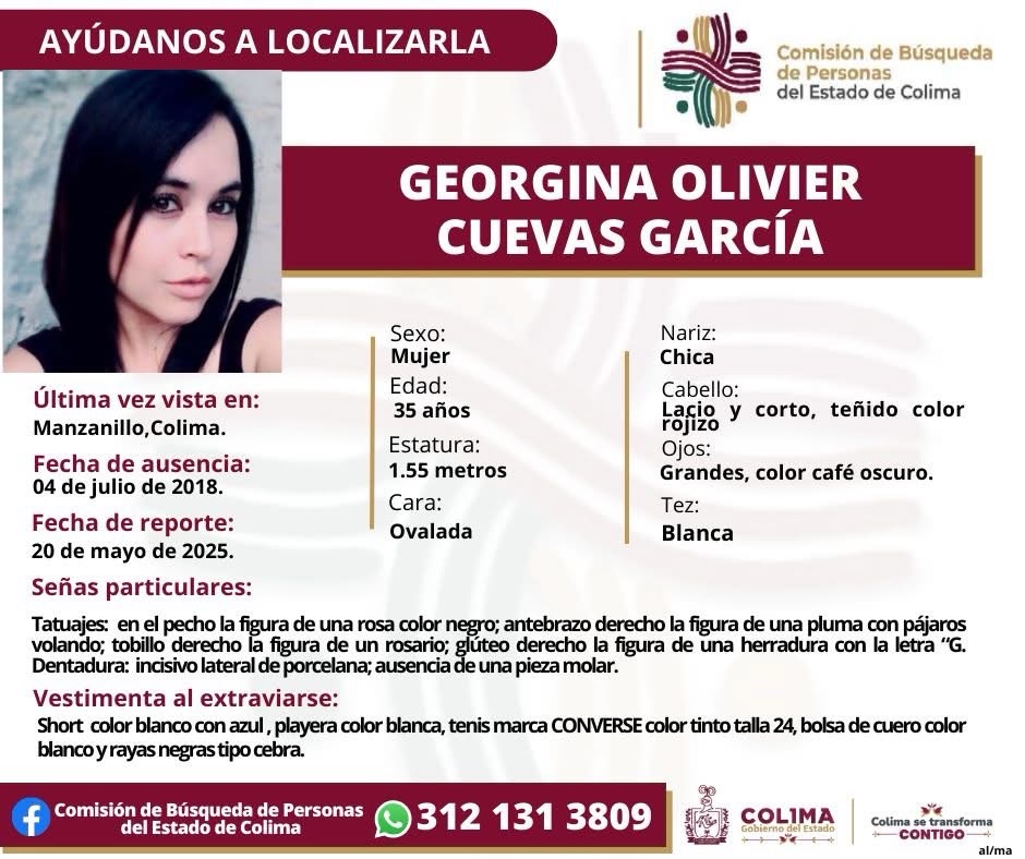 Colima, México, Avanzada (21/05/2025).- La Comisión de Búsqueda de Personas del Estado de Colima emitió una ficha de búsqueda para localizar a Georgina Olivier Cuevas García, quien fue vista por última vez en Manzanillo, Colima, el 4 de julio de 2018. Su desaparición fue reportada formalmente el pasado 20 de mayo de 2025, luego de casi siete años sin conocerse su paradero.