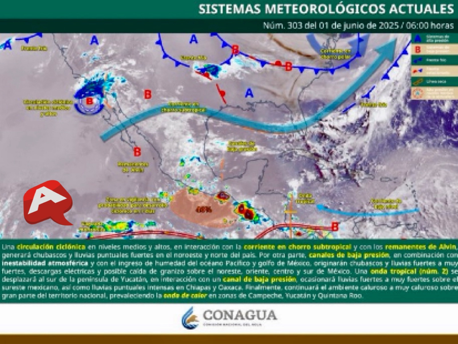 La presencia de una circulación ciclónica en niveles medios y altos sobre el noroeste de México, en combinación con la corriente en chorro subtropical y los remanentes del sistema Alvin, ha generado lluvias puntuales fuertes en regiones del norte y noroeste. En el caso de Colima, los efectos se traducen en inestabilidad atmosférica que, sumada al ingreso de humedad del océano Pacífico, ha favorecido la formación de nubosidad y lluvias.