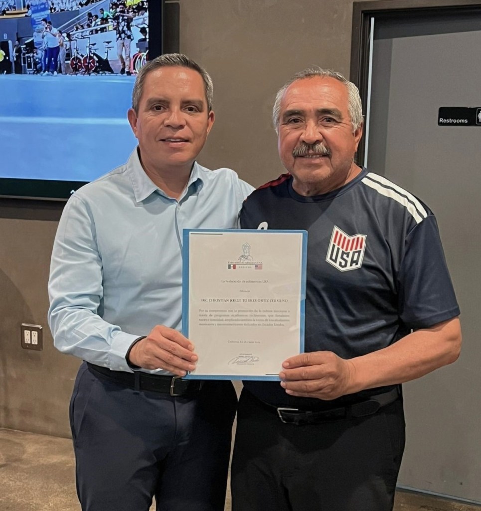 Los líderes colimenses entregaron al rector dos reconocimientos por su destacada labor al frente de la Universidad de Colima, su compromiso con la promoción de la cultura mexicana y por el impulso constante para fortalecer los vínculos entre la institución educativa y las comunidades migrantes.