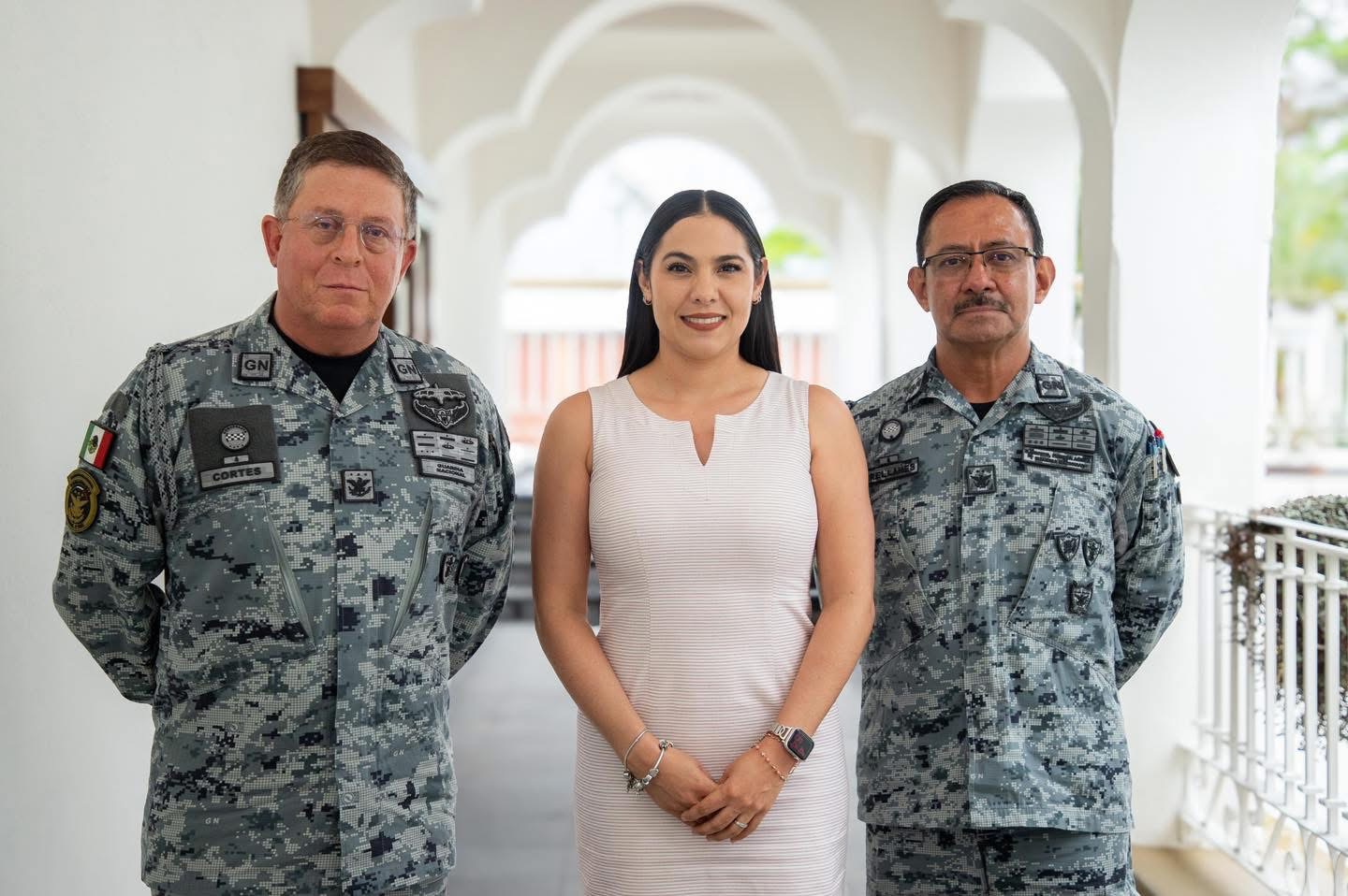 *En la fotografía, la gobernadora de Colima, Indira Vizcaíno Silva, el General Hernán Cortés Hernández, Comandante de la Guardia Nacional, y al General Eugenio Leonardo López Arellanes, Coordinador Territorial de la Región Occidente.