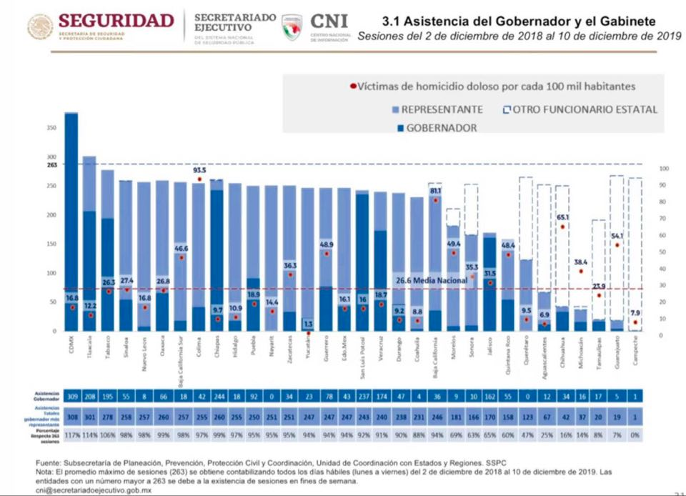 Este día, el secretario de Seguridad nacional, Alfonso Durazo hizo un recuento de las asistencias de los gobernadores en las reuniones de seguridad que se llevan en cada estado del país, desde el pasado mes de diciembre de 2018 cuando asumió el gobierno federal, Andrés Manuel López Obrador.