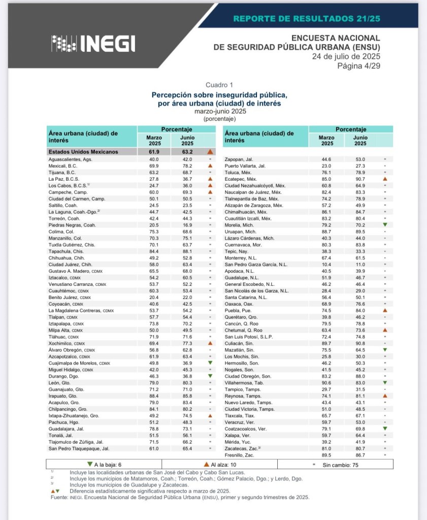 Entre las ciudades con mayor percepción de inseguridad destacan Culiacán (90.8 %), Ecatepec (90.7 %) y Uruapan (89.5 %). Por el contrario, San Pedro Garza García (11.0 %), Piedras Negras (16.9 %) y Benito Juárez, CDMX (22.0 %), reportan los niveles más bajos.