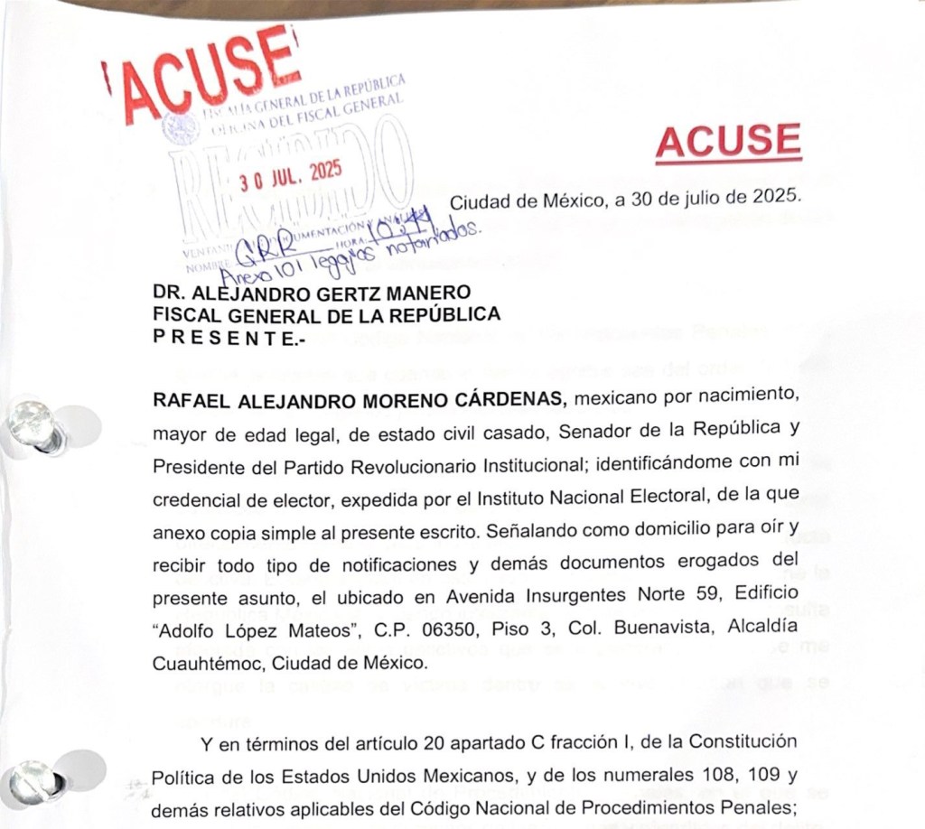 México, Avanzada (30/07/2025).- El Partido Revolucionario Institucional (PRI) presentó este miércoles una denuncia formal ante la Fiscalía General de la República (FGR) contra el presidente Andrés Manuel López Obrador y una decena de figuras prominentes de la autodenominada Cuarta Transformación, a quienes acusa de encubrimiento, traición a la patria y posibles vínculos con el crimen organizado.