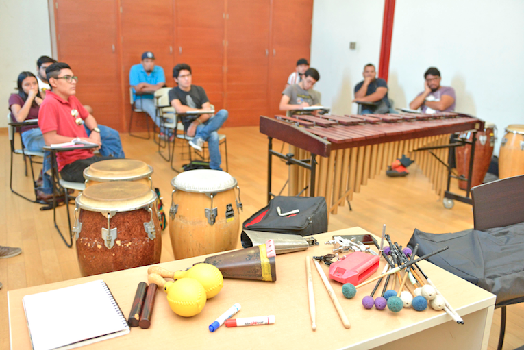 En su charla con alumnos de la Escuela de Música, explicó que la marimba es de los instrumentos de orquesta más jóvenes, “estamos hablando de una historia de 100 años o menos para llagar a ser lo que conocemos ahora”, dijo el maestro de música.