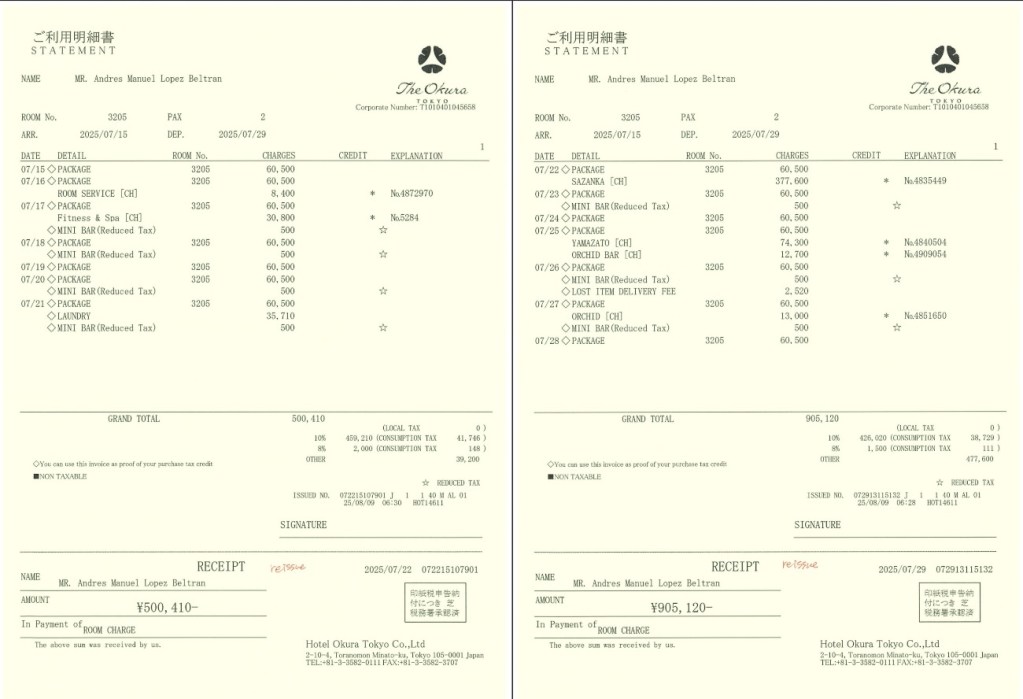 En la primera factura, correspondiente al periodo del 15 al 21 de julio, se registran cargos por 500 mil 410 yenes (63 mil 57 pesos), incluyendo servicios adicionales como spa, lavandería y minibar. La segunda factura, del 22 al 28 de julio, muestra consumos por 905 mil 120 yenes (114 mil 164 pesos), que abarcan además gastos en bares y restaurantes.