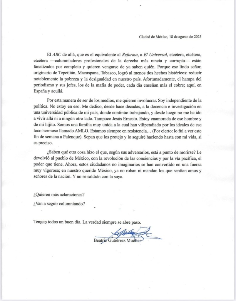Ciudad de México, Avanzada (18/08/2025).- La esposa del expresidente Andrés Manuel López Obrador, Beatriz Gutiérrez Müller, negó categóricamente las versiones periodísticas que aseguraban que se había trasladado a España con su hijo Jesús Ernesto para que él cursara la carrera de Derecho en la Universidad Complutense de Madrid.