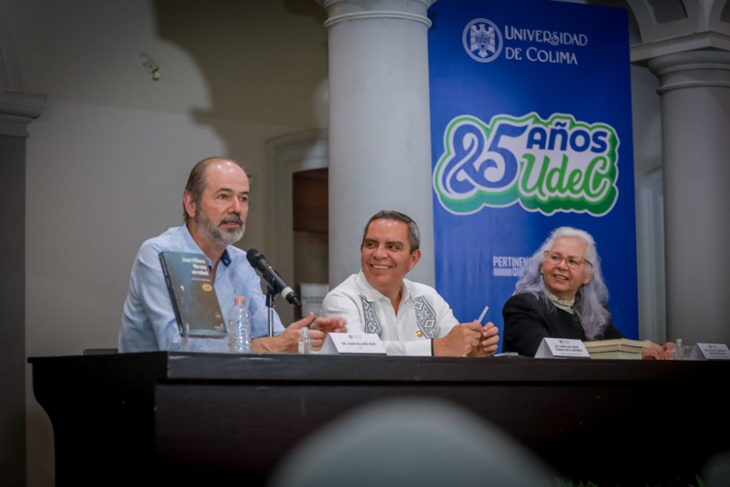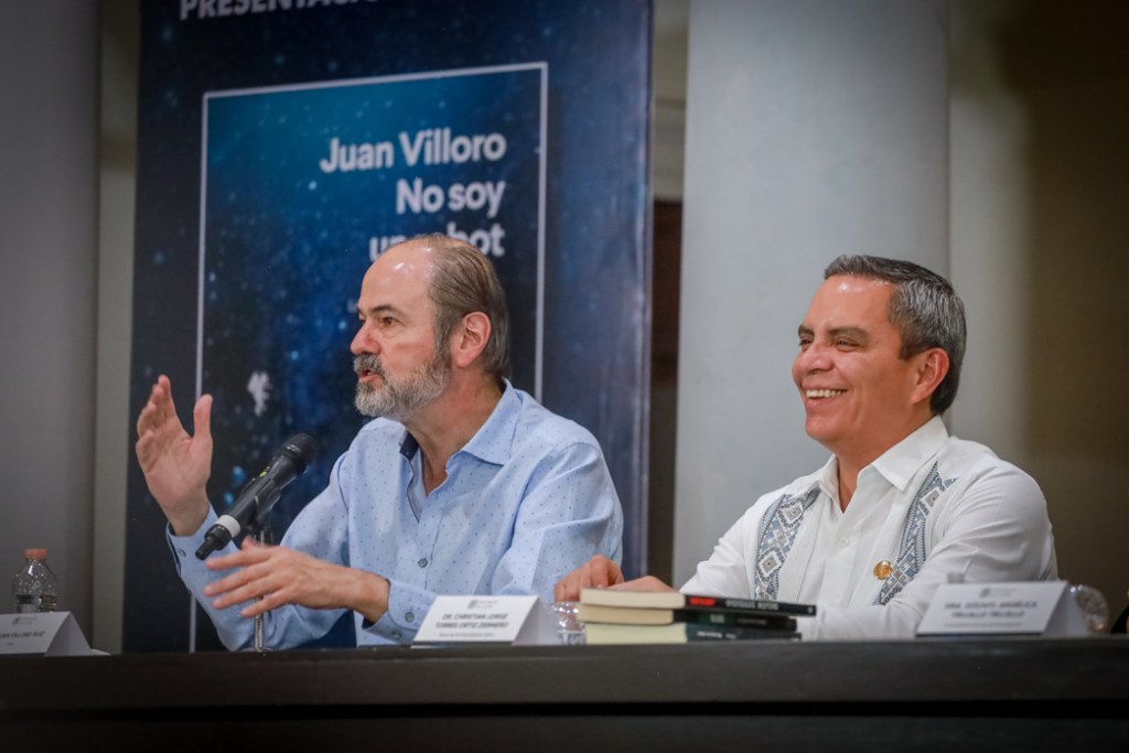 Colima, México, Comunicado (28/08/2025).- Juan Villoro, distinguido con el Doctorado Honoris Causa por la Universidad de Colima, presentó este miércoles por la tarde, en la Pinacoteca Universitaria, su más reciente libro No soy un robot. Lectura y la sociedad digital, una obra que, con mirada crítica e ingeniosa, examina los retos que plantea la revolución tecnológica y sus implicaciones éticas, culturales y humanas.