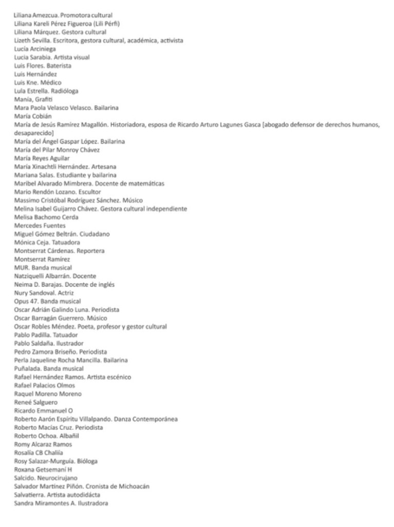 El texto es suscrito por figuras como la historiadora María de Jesús Ramírez Magallón, esposa del abogado y defensor de derechos humanos Ricardo Arturo Lagunes Gasca, desaparecido en enero de 2023 en Tecomán junto con el maestro Antonio Díaz Valencia.