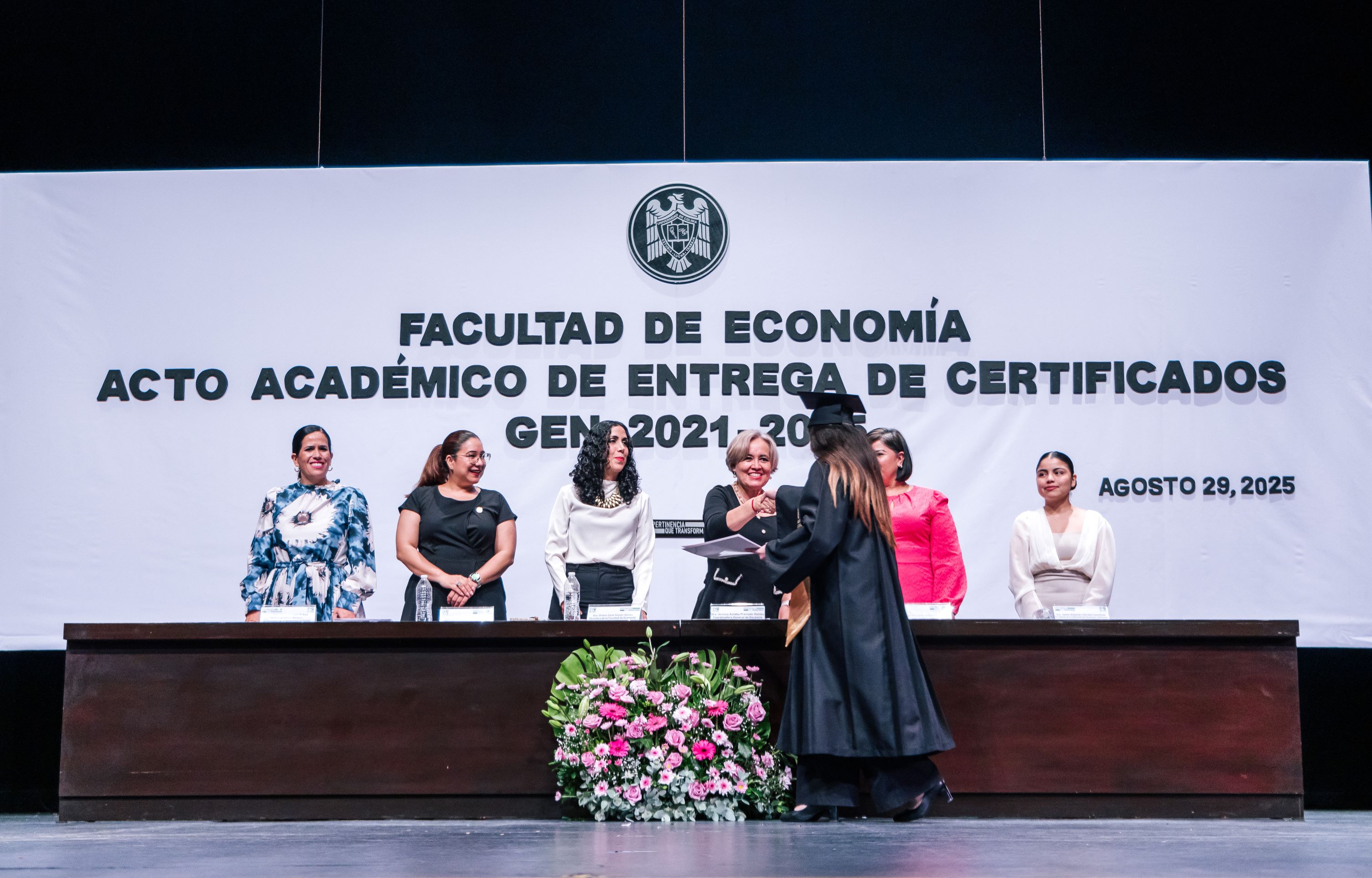 Colima, México, Comunicado (31/08/2025).- En una ceremonia realizada este viernes por la tarde en el Teatro Universitario, la Universidad de Colima, a través de la Facultad de Economía, entregó 168 certificados a egresados de la generación 2021-2025 de las licenciaturas en Economía, Finanzas y Negocios Internacionales, así como a seis egresados del Doctorado en Relaciones Transpacíficas.