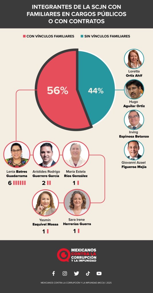 En la nueva conformación de la SCJN, integrada ahora por nueve ministros, se identificó que cinco de ellos (56%) tienen al menos un pariente en el gobierno, sumando en total 11 vínculos familiares. Destaca el caso de la ministra Lenia Batres, quien cuenta con seis familiares en distintos puestos públicos, entre ellos su hermano Martí Batres, actual director del ISSSTE, y su hermana Valentina, diputada local en la Ciudad de México.
