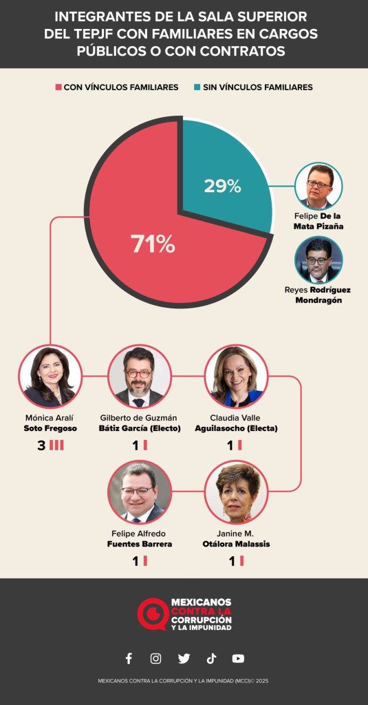 La situación es aún más marcada en la Sala Superior del Tribunal Electoral, donde cinco de sus siete magistrados (71%) cuentan con familiares en instituciones del gobierno federal o local, con un total de siete casos documentados.