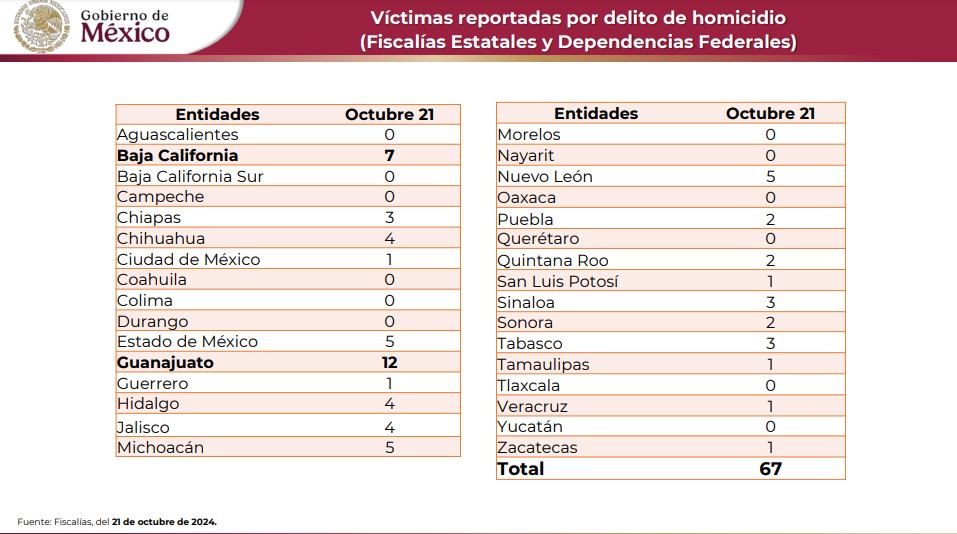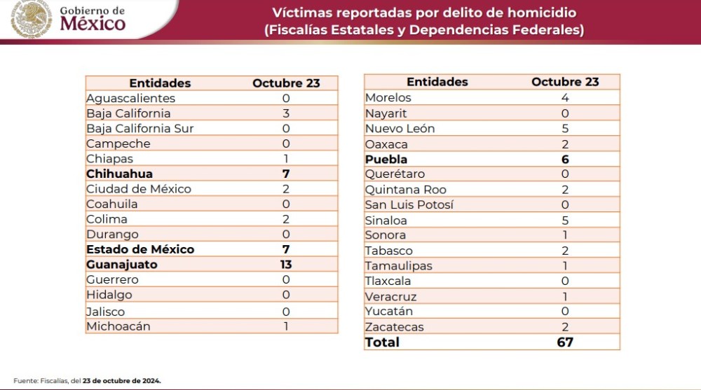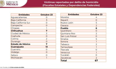 Colima, México, Avanzada (24/10/2024).- La Secretaría de Seguridad y Protección Ciudadana informó que ayer se registraron un total de 67 homicidios dolosos en todo el país....